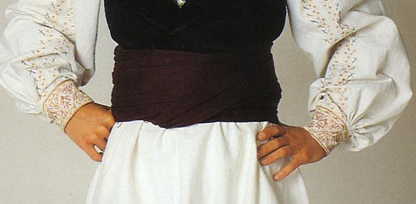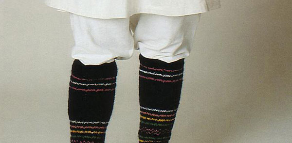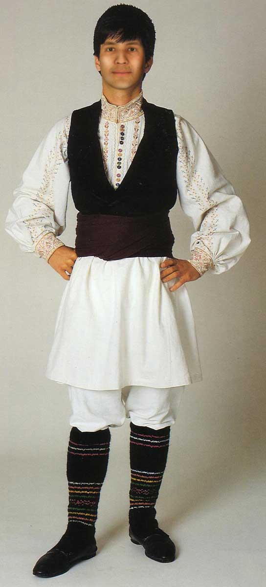 Στα κάτω άκρα φοριέται άσπρο λινό εσωτερικό παντελόνι που μπαίνει μέσα στις υφαντές χρωματιστές κάλτσες που φτάνουν ως το γόνατο.Απο πάνω πουκαμίσα φαρδιά άσπρη μακριά-λέγεται πουκάμισο ή φουστανέλα-κεντημένη με χρωματιστές κλωστές στα μανίκια στο γιακά και στο στήθος.Τη φορεσιά συμπληρώνει γιλέκο μαύρο μάλλινο σταυρωτό και ζωνάρι μάλλινο βαθυκόκκινο που τυλίγεται πάνω απο το γιλέκο.Η μέση στολίζεται με μαντήλι πολύχρωμο κλαρωτό.Στο κεφάλι μαύρο καλπάκι.