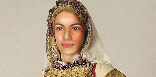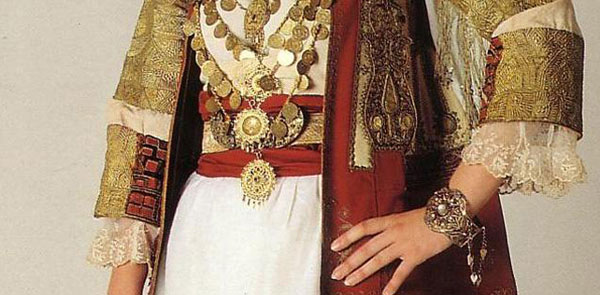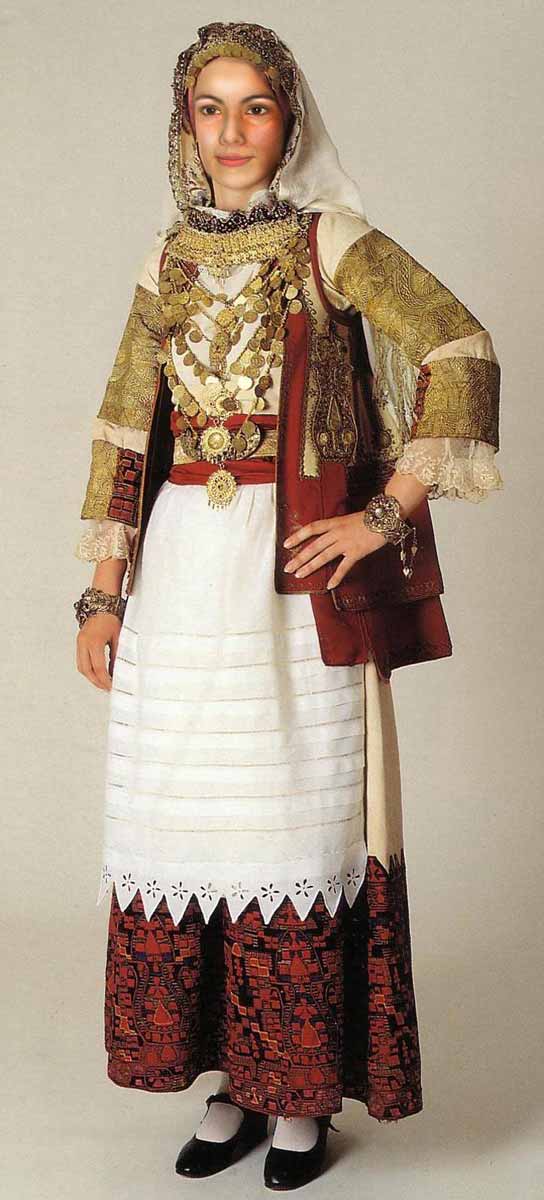 Η συγκεκριμένη φορεσιά χαρακτηρίζεται απο τον πλούσιο διάκοσμό της. Αποτελείται απο το κόκκινο φόρεμα, την άσπρη ποδιά το κόκκινο διπλόφαρδο γιλέκο με τα κεντημένα μανίκια και τα κοσμήματα που στολίζουν ολόκληρο το στήθος, αλυσίδες με φλουριά ενώ το λαιμό κοσμεί το γκιουρντάνι. Στο κεφάλι δένεται λευκό μεταξωτό μαντήλι που στις άκρες του κρέμονται φλουριά.