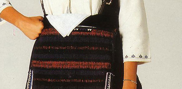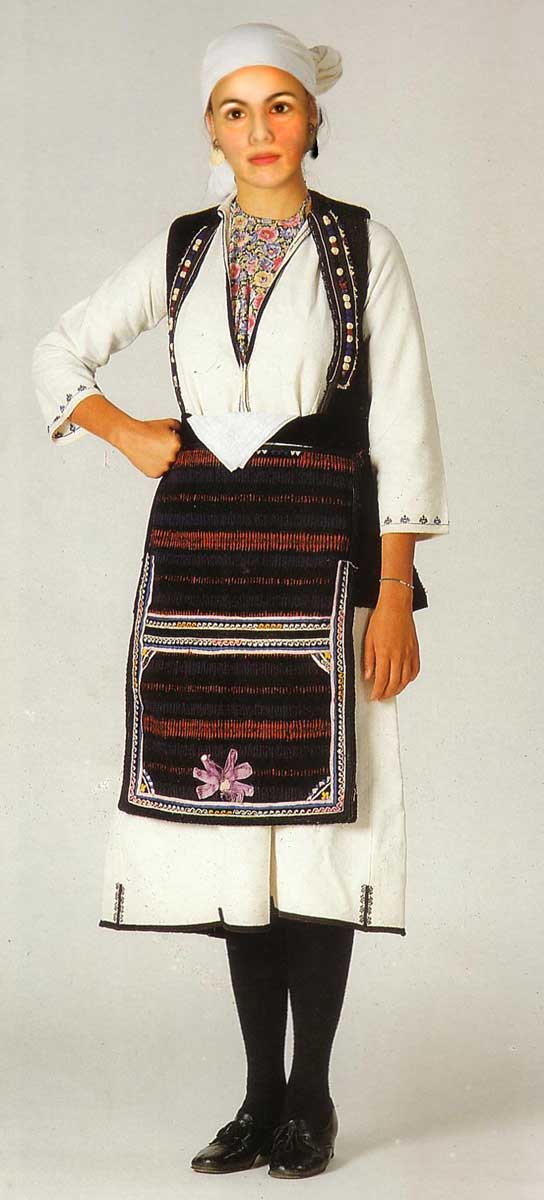 Η φανέλα έχει πλεκτά κατωμάνικα και η λευκή τραχηλιά είναι στολισμένη. Το πουκάμισο έχει λευκοκεντήματα στο ποδόγυρο. Το πανωφόρι είναι λευκό ή μαύρο,αμάνικο και λέγεται σαγιάς. Το ζωνάρι είναι μακρύ μάλλινο,μαύρο-άσπρο,ριγέ και διπλωμένο κατά μήκος στα δύο. Η ποδιά δένεται πάνω από το ζωνάρι,είναι υφαντή στολισμένη με κεντήματα και φλουριά. Τη κοσμούν τα βαρύτιμα κλειδωτήρια. Το κεφάλι στολίζει λευκό μαντήλι.