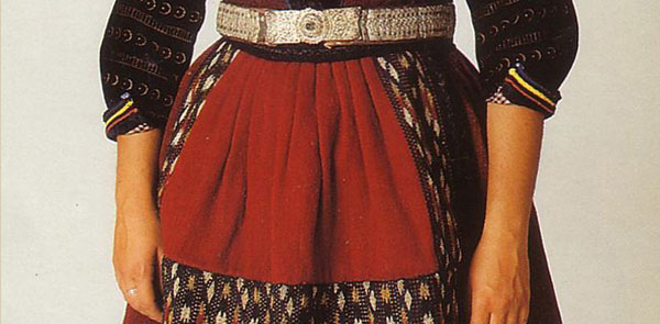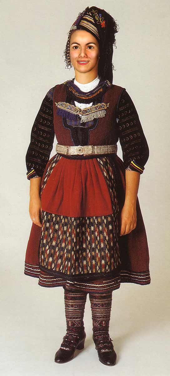 Η στολή αποτελείται από περίτεχνη καυσία στην κεφαλή, που προστατεύεται από μαύρη μαντίλα. Φαρδύ και μακρύ σκούρο φόρεμα με κοντά μανίκια,που συγκλίνουν λίγο πιο κάτω από τον αγκώνα. Γιλεκάκι με πλούσια λαιμαριά και κόσμημα μπροστά στο στήθος με μεταξωτά κρόσσια που εντυπωσιάζουν κατά την κίνηση. Ποδιά με γεωμετρικά σχήματα που παραπέμπει στον αρχαίο ελληνικό χαρακτήρα της φορεσιάς. Πλεκτές μάλλινες κάλτσες με οριζόντια πολύχρωμη λεπτή διακόσμηση και μοντέρνα υποδήματα.