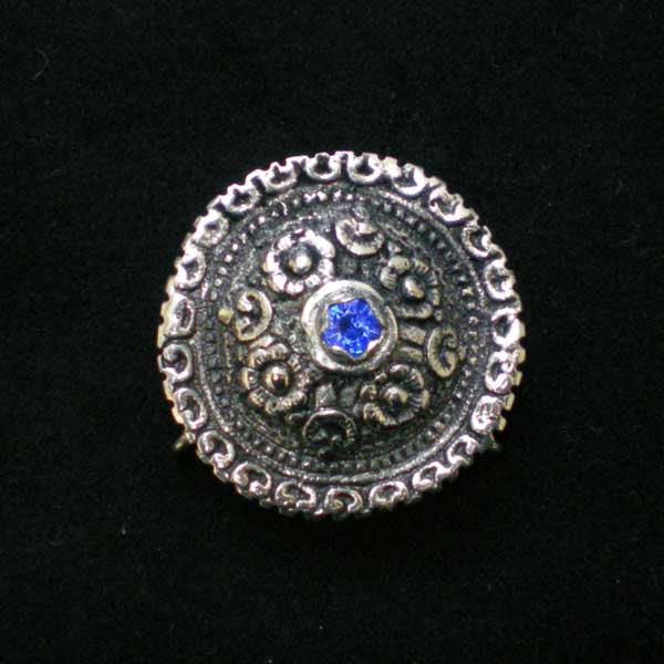 Τοκάς χυτής κατασκευής μαλαμοκαπνισμένος. Διακρίνονται φιγούρες λουλουδιών, σκαλιστές σε ολόκληρο το κόσμημα. Στη μέση υπάρχει πέτρα σε γαλανό χρώμα ενώ απο πίσω έχει κοψιάδες και κρίκους για να σκαλώνει στα υφάσματα