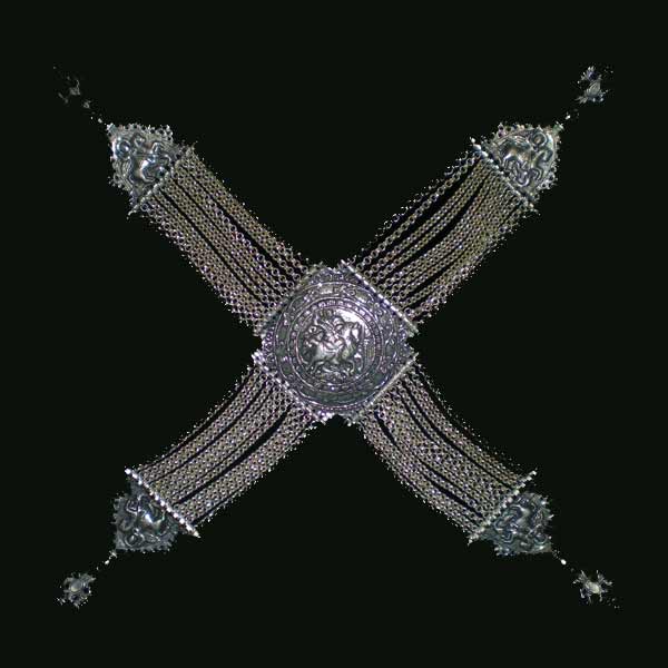 Επάργυρο κιουστέκι σε σχήμα σταυρού (σε πλάγια θέση). Στο κεντρικό κομμάτι απικονίζεται η μορφή του Αγίου Γεωργίου όπως και στα τέσσερα ακρα και ενώνονται μεταξύ τους με βυζαντινή αλυσίδα. Στις άκρες υπάρχουν κόπιτσες που στερεώνουν το κόσμημα στο στήθος ή την πλάτη.