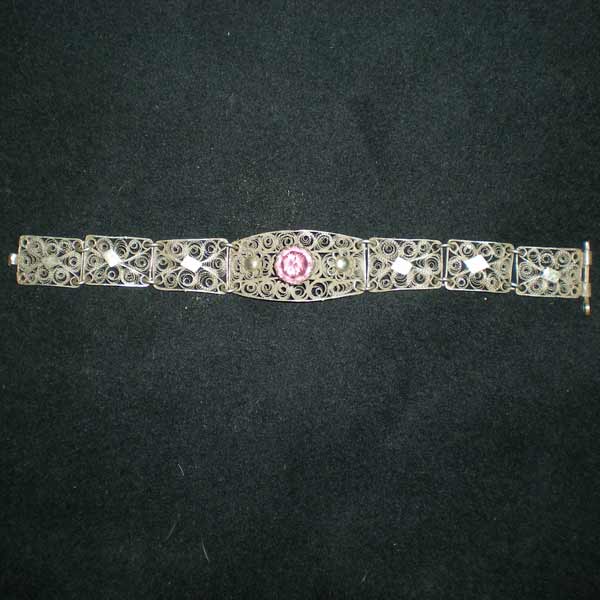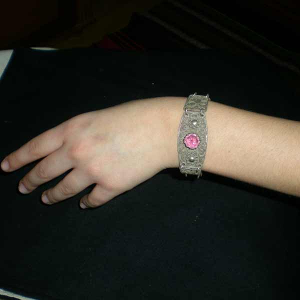 Γυνακείο βραχιόλι καρπού. Φτιαγμένο στο χέρι απο ασημένιο σύρμα. Στη μέση δεσπόζει πέτρα ρόζ χρώματος ενώ στην άκρη έχει υποδοχή για το πυράκι με το οποίο κουμπώνει το κόσμημα.