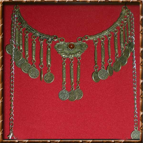 Γυναικείο ασημένιο κόσμημα λαιμού δουλεμένο στο χέρι, απαρτίζεται απο πολλά σκαλιστά κομμάτια τα οποία ενώνονται μεταξύ τους με κρίκους. Φέρει σχέδια Ασιατικής προέλευσης.