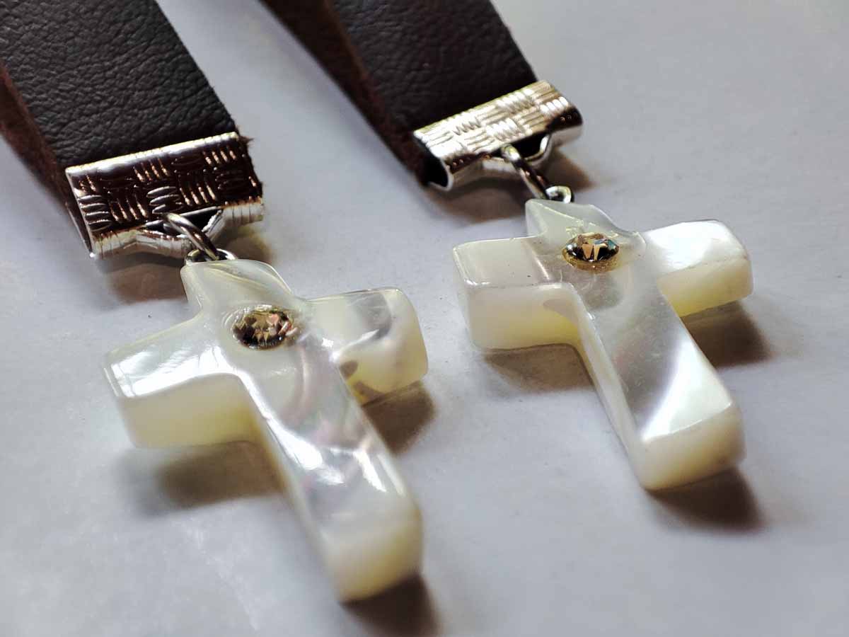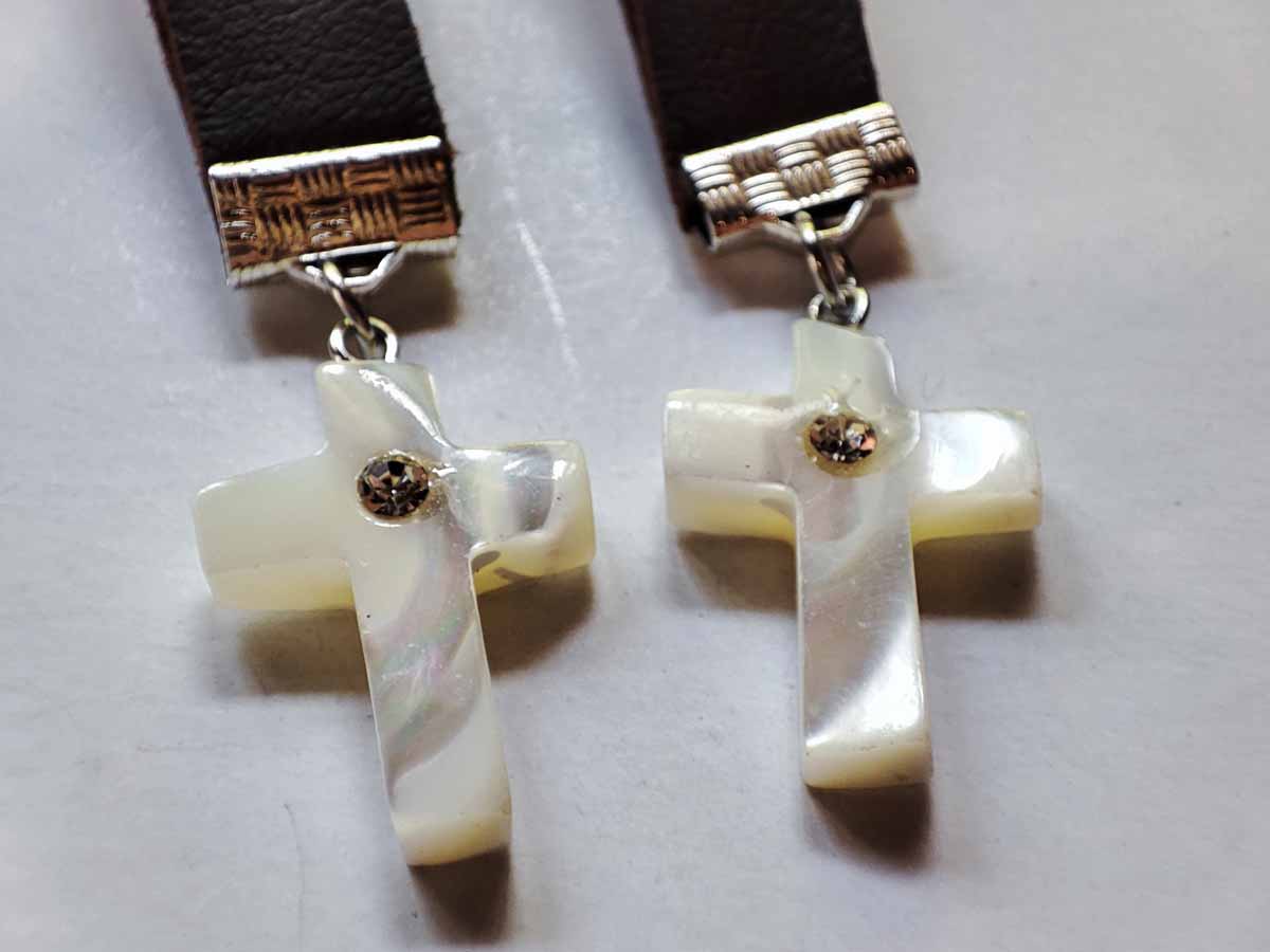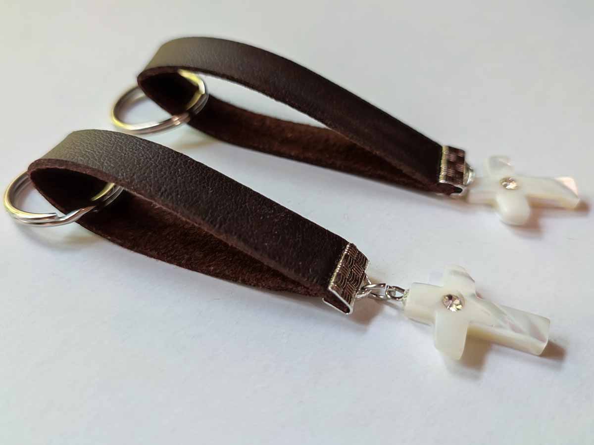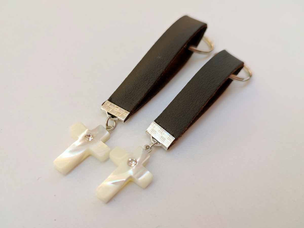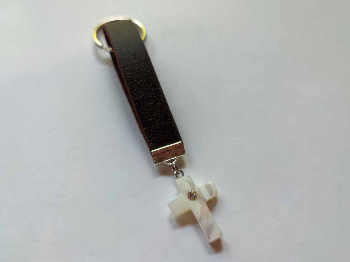 Χειροποίητο Μαρτυρικό βάπτισης με Σταυρό απο φύλντισι με στρας νίκελ, κρεμαστό μπρελόκ αποτελούμενο απο κρικάκι για κλειδιά, δερμάτινο λουράκι 7cm μήκος, πιάστρα και κρίκο με σταυρό.