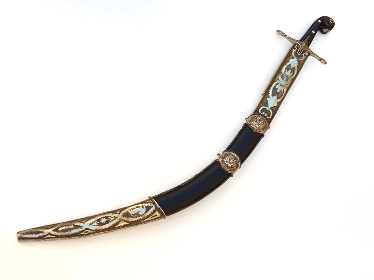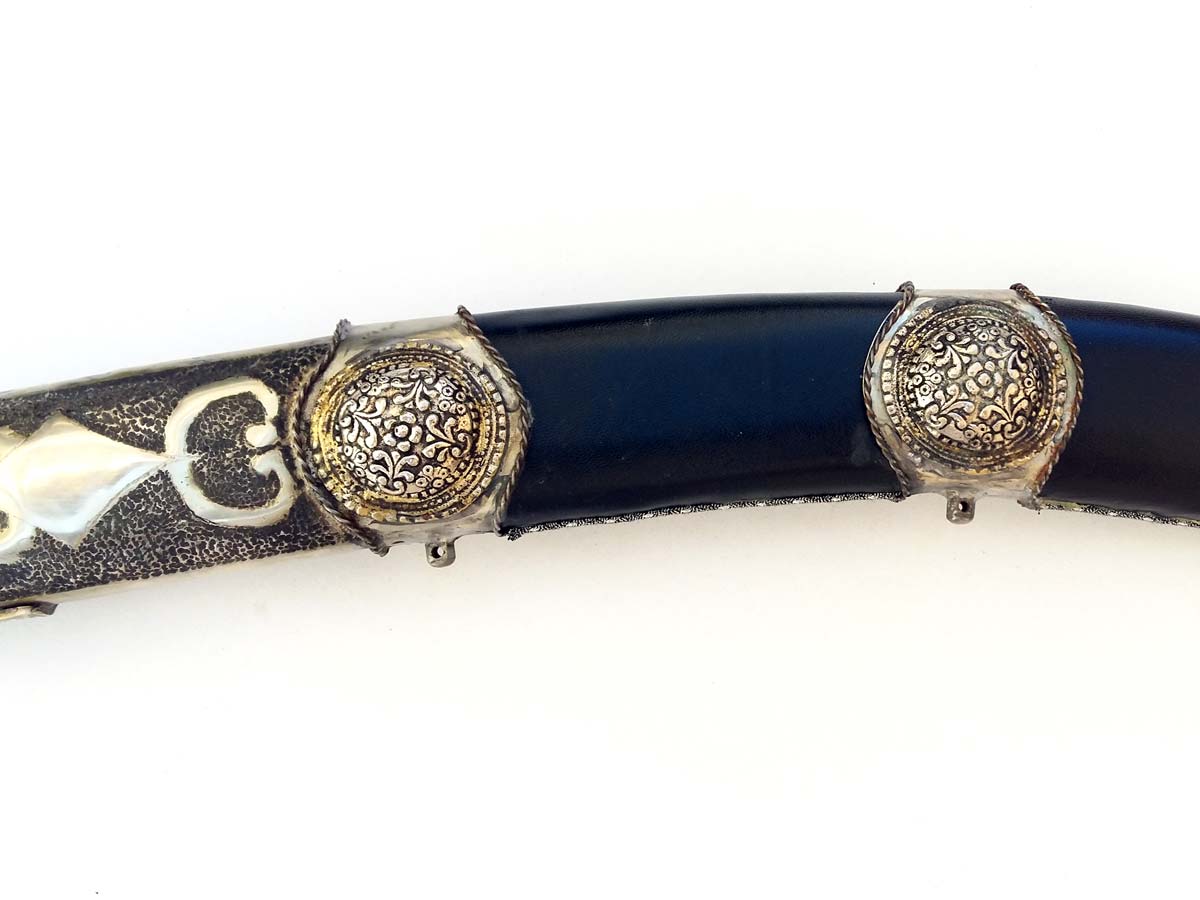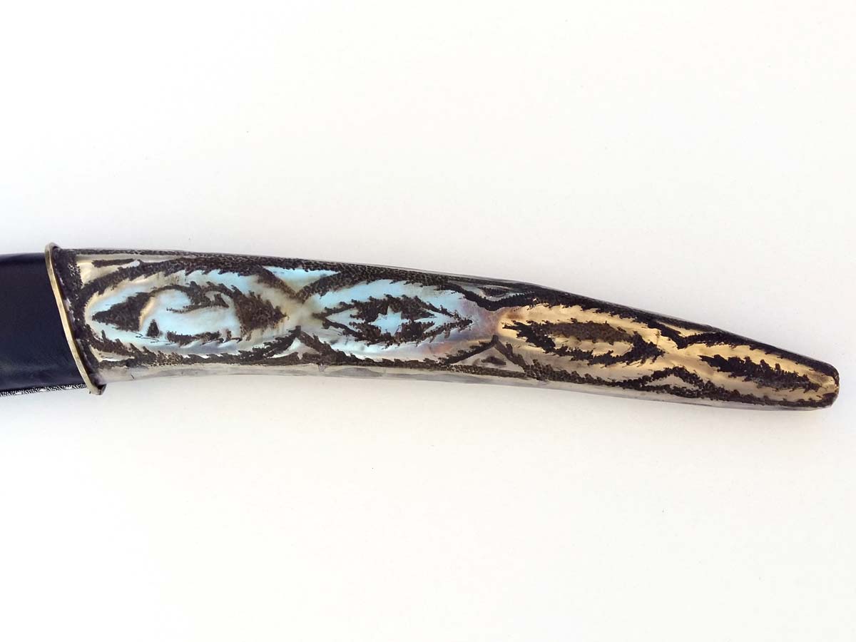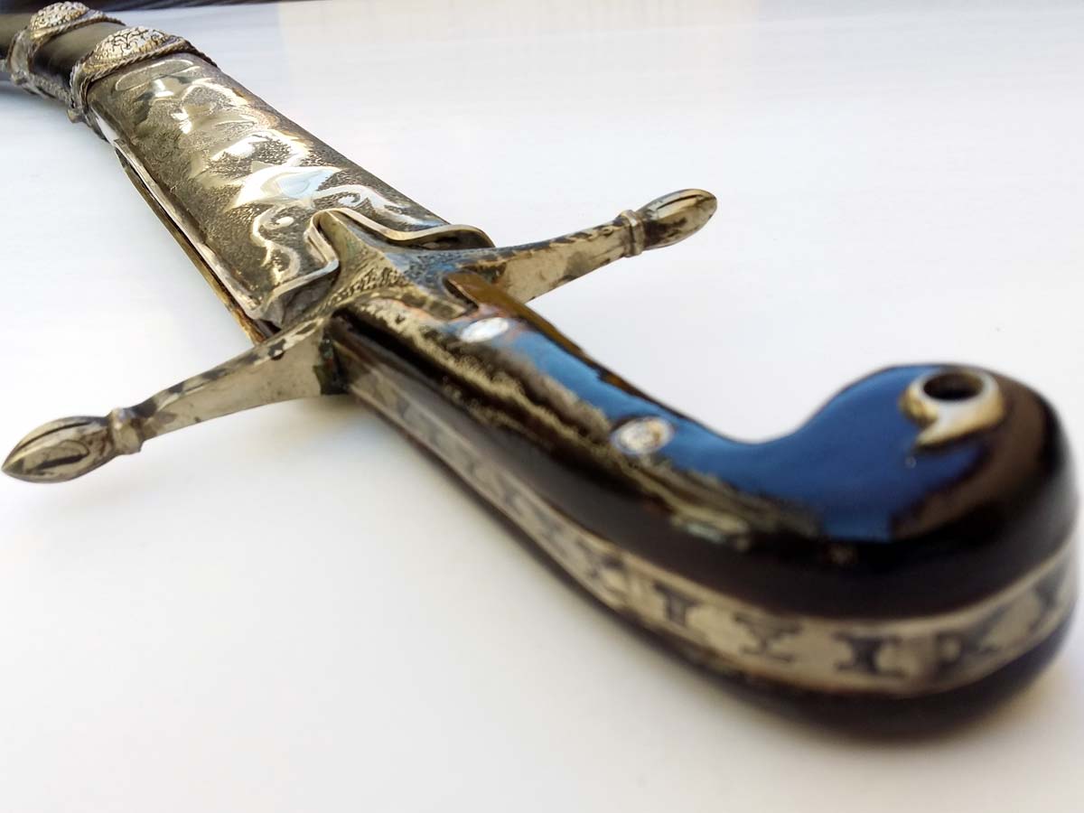Πιστό αντίγραφο από τούρκικο σαμσίρ σκαλιστό. Φτιαγμένο από ατσάλι, χτυπημένο σε καμίνι πάνω σε παλιό ορνέκι του εργαστηρίου μας. Το θηκάρι είναι ντυμένο από μαύρο δέρμα και ασήμι(αρζαντώ). Η σφυρηλάτιση έχει γίνει με το χέρι σε γεωμετρικά σχήματα. Συνοδέυεται απο ένα κορδόνι με φούντες για τη θήκη και μία φούντα για το μανίκι.